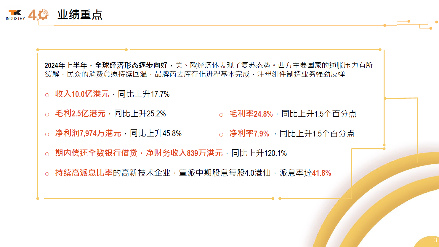 期内,由于订单充足,产能利用率较去年同期显著提升,加上集团持续对生产流程进行全面优化和改进,落实降本增效措施,集团毛利上升25.2%至250.0百万港元(2023年上半年:199.7百万港元),毛利率上升1.5个百分点至24.8%(2023年上半年:23.3%)。随着新项目逐步渡过前期投资期,生产效率将进一步提升,预期下半年毛利率表现持续改善。2024年上半年,集团严谨管控行政开支,行政开支占收入比下降至13.5%(2023年上半年:14.7%);同时,集团偿还全数银行贷款及适度进行稳健理财,净财务收入增加120.1%至8.4百万港元。本公司拥有人应占溢利较去年同期大幅上升45.8%,录得79.7百万港元(2023年上半年:54.7百万港元)。净利率增加1.5个百分点至7.9%(2023年上半年:6.4%),每股基本盈利为9.6港仙(2023年上半年:6.6港仙),较去年同期上升45.5%。