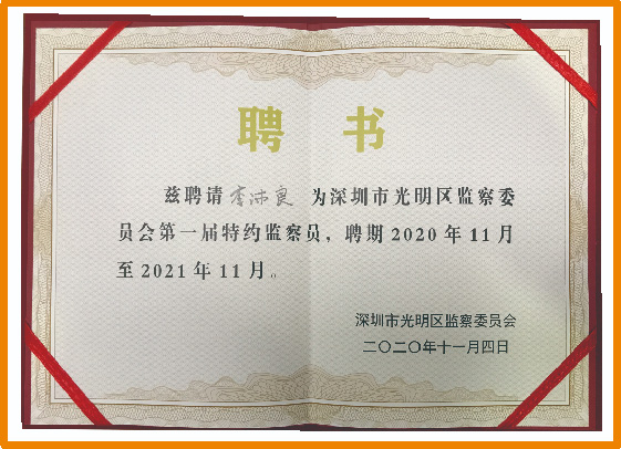 11月4日,光明区监委召开第一届特约监察员聘请会议,优选聘请16名特约监察员。区委常委、区纪委书记、区监委主任姚文胜为特约监察员颁发聘书并讲话。他强调,特约监察员要肩负起职责与使命,同全区纪检监察干部一起,齐心协力为全区推进全面从严治党、扎实开展党风廉政建设和反腐败斗争,为光明区打造世界一流科学城和深圳北部中心作出应有贡献。