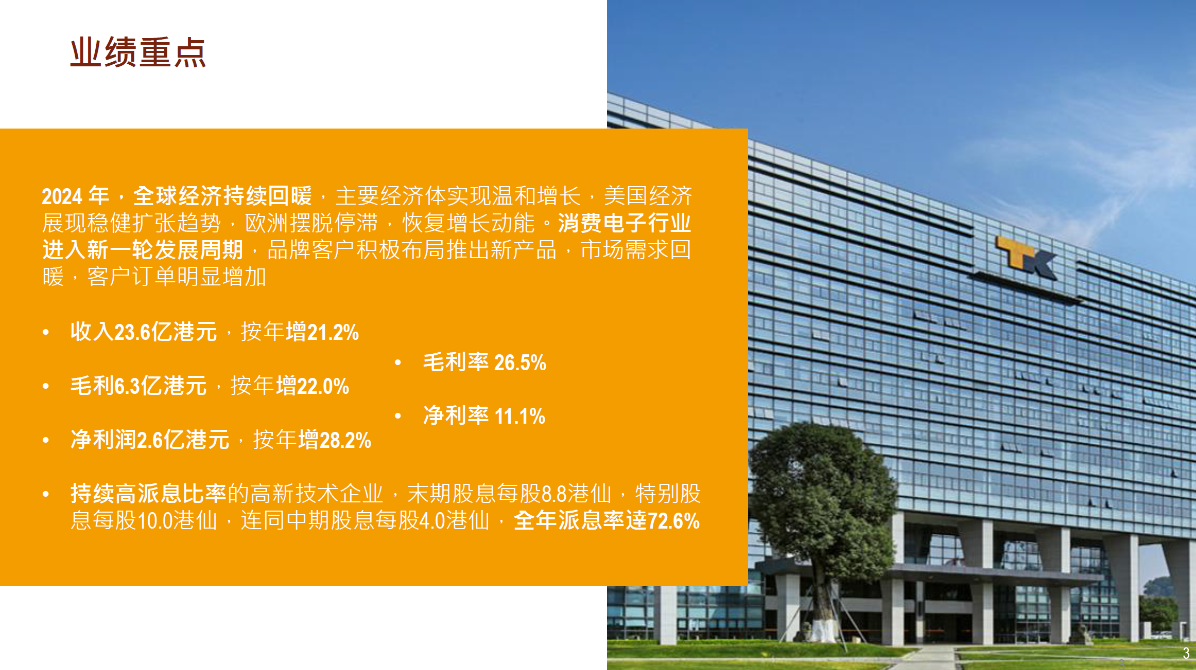 2024年,随着新产品投入量产,订单量反弹回升,产能利用率显著提升,集团持续优化生产流程与提升管理效率,降本增效措施成效持续释放。年内,集团毛利上升22.0%至625.8百万港元(2023年:512.8百万港元),溢利较去年同期大幅上升28.2%,录得261.9百万港元(2023年:204.2百万港元),净利率上升0.6个百分点至11.1% (2023年:10.5%),每股基本盈利为0.32港元(2023年:0.25港元),较去年同期上升28.0%。